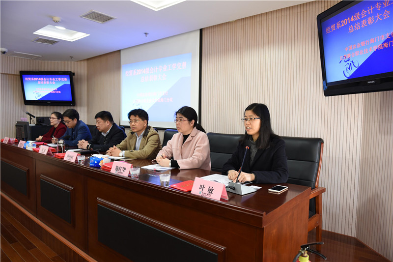 经贸系自2017年11月至2018年3月在2014级会计专业学生中开展了工学交替实践活动,为总结工学交替实践教学活动的经验与不足,为今后的工学交替实践教学活动提供经验,3月28日上午9:00,经贸系2014级会计专业学生工学交替表彰大会在海门农行总部十楼会议室隆重举行。海门农行副行长龚斌、海门中专副书记、副校长周桂岐、校企合作办主任纪红兵、经贸系主任施红华、主任助理何小华,班主任董美华和宣露露老师和58名工学交替学生与会,大会由农行综合部主任叶敏主持。 首先,叶敏对同学们四个多月的实践工作进行了详细点评,表扬了同学们的吃苦耐劳精神;服从指挥,融入岗位的担当精神;虚心认真,积极主动请教的学习精神,也指出了个别同学有待改进加强之处。 随后,龚行长进行总结。他对58名学生在这次工学交替中的表现给予肯定,介绍了2017年农行取得的重大成效,也离不开同学们的不懈努力。最后对同学们提出了四点期望:一是要总结实习生活,促使自我成长;二是要认识到生活的不易,懂得珍惜;三是要继续发扬优良品质,保持向上的精神;四是常“回家”看看,努力学习,争取能成为农行的正式员工。