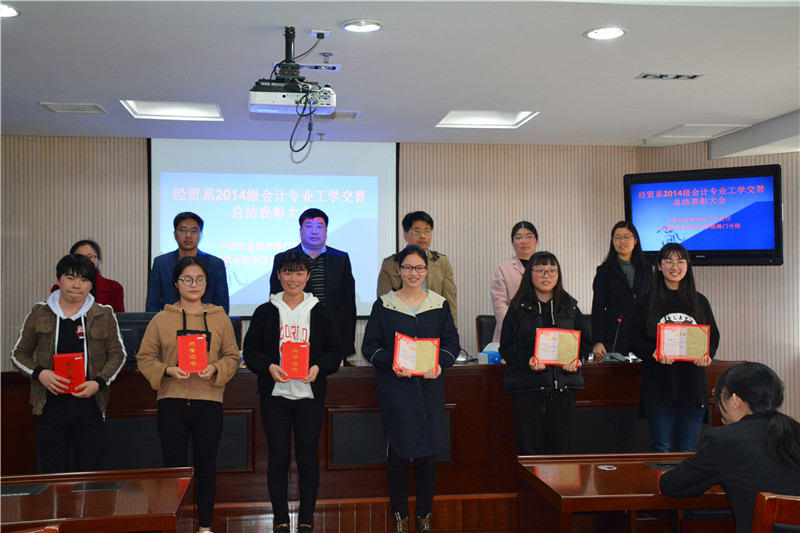 接着,施红华宣读了工学交替优秀实习生的表彰决定,在场领导为16位优秀实习生颁发荣誉证书。 最后,周桂岐作了总结发言。他对本次工学交替给予了肯定,表示此次工学交替圆满成功离不开银行、学校双方的不懈努力,希望今后与农行继续合作,为学校人才培养、教学改革指明方向。他希望系部能够继续高度重视校企合作,打开新时代的教育;希望同学们能总结实习经验,有效进入角色转变,进入紧张的考证复习阶段。