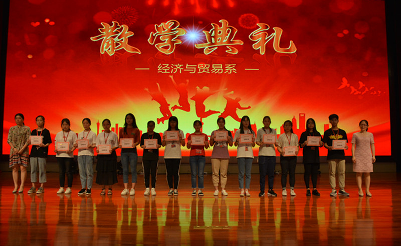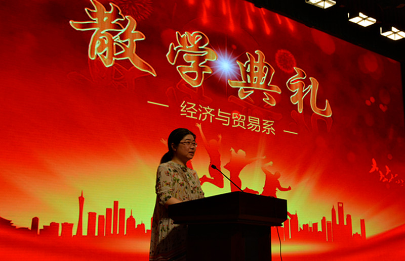 随后对以上班级、学生进行了颁奖。希望获得荣誉的班级、同学们能够再接再厉,充分发挥模范带头作用,同时号召其他同学向他们学习,争取更大的进步。 随后施红华总结讲话,她列举了经贸系本学期取得的成绩,总结了一学期以来经贸学子紧张充实而又愉快难忘的学习生活,高度评价了同学们在丰富多彩的学习生活中展现出来的积极向上,勤奋进取的优良学风,表扬了同学们展现出的经贸学子的风采。她希望同学们利用暑假充裕的时间认真回顾过去一年的学习生活情况,梳理自己的成绩、不足,优点、缺点,做好新学期新挑战的思想准备。她向全体同学提出了学习、安全、生活、健康等四个方面的暑假要求!并就返校的时间、要求作了强调。最后施红华衷心祝愿全体老师和同学们过一个平安、快乐、健康、文明、丰富多彩的暑假。 散学典礼在阵阵热烈的掌声中圆满结束,我们相信同学们会以更加饱满的精神、更加激昂的斗志迎接新的学期!(黄燕婷)