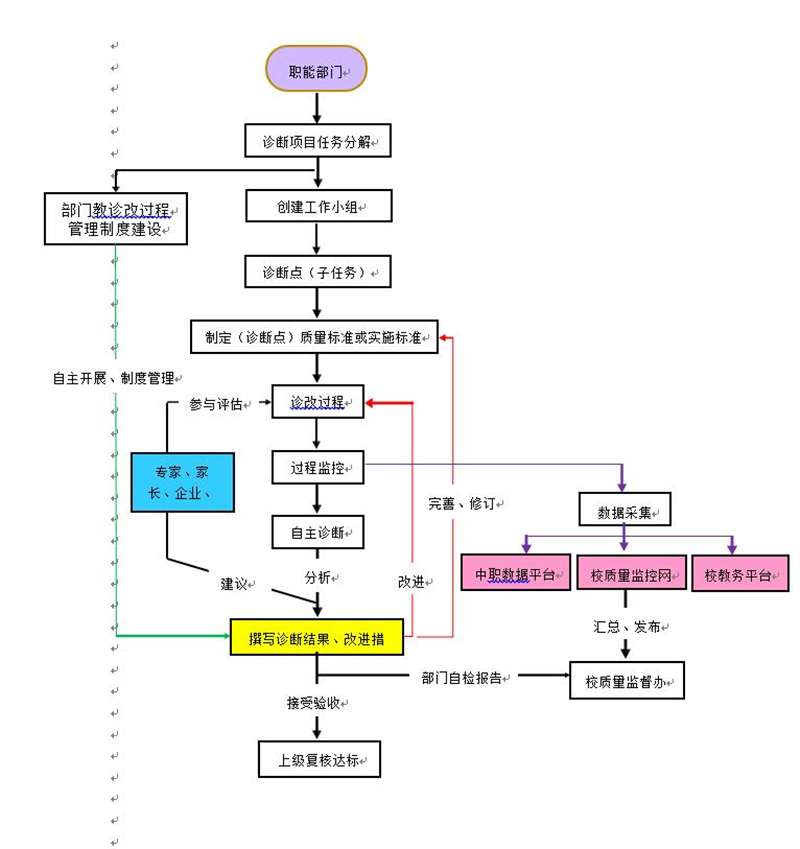 一、实施原则 教学工作诊断与改进,是学校质量提升和内涵发展的基础工作,既是中心工作更是全面工作,覆盖到办学的方方面面,不能狭义理解为教学业务工作。需要各职能部门、各管理层次、全体教师全员参与诊改过程。学校的领导层、中层、教师,三个层面要共同强化质量自主建设、自我保证意识,方能将教学工作诊断与改进落到实处,在更高水平和层次上提升人才培养质量。 根据教育部对开展质量年度报告工作提出的原则性要求,我校的教诊改工作推进、实施,严格遵循“分级负责、分步实施、持续改进”的原则。 二、实施流程 1.各工作组对接受诊断项目任务进行再分解,组建工作小组,制订部门教诊改过程管理制度。 2.工作小组根据子任务,制订相应校级质量标准(或实施标准)。 3.在质量标准(或实施标准)的基础对子任务实施诊改与过程全方位监控。 4.对诊改过程数据(数字、文字、图像)实时进行采集,并输入相应数据平台:中职数据平台、校质量监控网、校教务平台。 5.工作小组对子任务实施阶段性自主诊断,也可邀请行业专家、家长、第三方(根据省教诊改文件要求组建)小组一并参与评估。 6.工作小组在部门研讨、专家建议的基础上,反思质量标准(或实施标准)或诊改过程管理是否科学、合理,进行完善、改进,同时撰写子任务自主诊断结论及后阶段改进措施,呈报校质量监督办。质量监督办汇总、整理后统一发布。 7.在制度管理下,工作组下设的各工作小组按上述第3至6步骤,循环实施、自主改进,直至上级复核达标通过。 教学诊断与改进工作组实施流程图