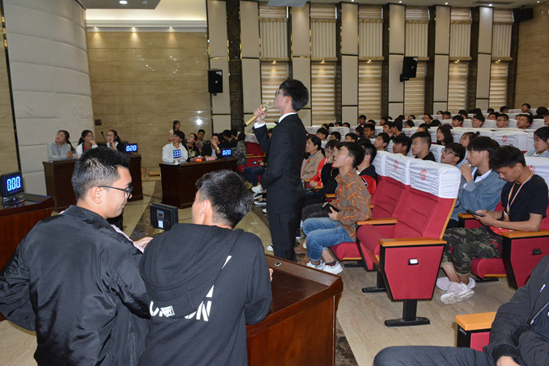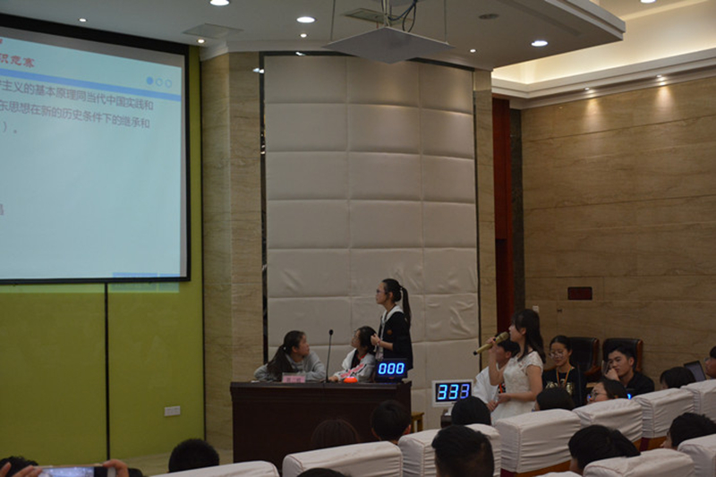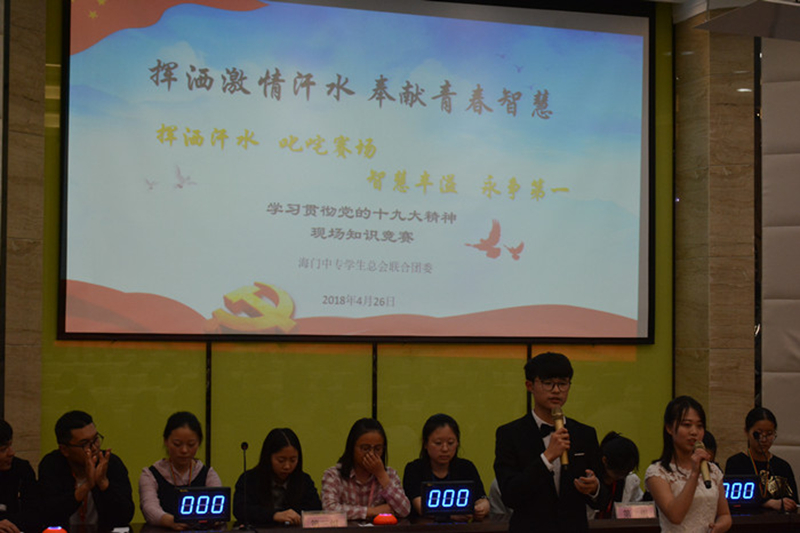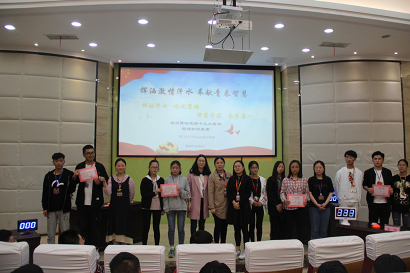 4月26日下午3:00点,由学生工作部联合团委举办的“挥洒激情汗水 奉献青春智慧” ——十九大精神进校园知识竞赛在E楼大师报告厅正式拉开了帷幕。出席本次活动有学生工作部副主任李建英、团委副书记江金丹和杨滨榕,以及全体学生会成员和团委干部。 在这里,可谓是精英荟萃,来自各大部门的佼佼者自信满满,万事俱备只欠东风。他们的知识储备以及随机应变能力在场发挥极致,像是一场激烈的追逐赛,又像是一场知识的完美诠释。 本次比赛有四支团队进行对决。比赛共分为三个环节:必答题、抢答题和风险题。在比赛的现场,各参赛团队反应迅速,竞相展现丰富的党史知识,正答率极高,难分伯仲。团队间的相互促进,队员间的相互鼓励,使得选手们一次次用自信征服全场师生。选手们用他们颇为专业的表达,将比赛一次次推向高潮。 随着时间的推移,这场激烈的比赛也已经接近尾声,最终结果为第二组以140的高分,勇夺特等奖,他们思维敏捷,知识储备全面,在抢答环节中挥洒激情与青春,实至名归;第一组以130分的成绩荣获一等奖,搭档间配合默契,积极挑战,也毫不逊色;第四组120分获得二等奖,他们的自信与活力也点燃了现场;第三组90分获得三等奖,有一丝可惜,却依旧不会放弃,虽败犹荣。 最后,李主任对本次比赛进行了点评并对今后的比赛提出了更高的期望:“这次比赛的选手们准备到位投入,过程非常精彩。希望以后的比赛能够扩大覆盖面,使之更为严谨,更为丰富,更好地与观众互动。”接下来由杨滨榕主任发表讲话。她表示,本次党史知识竞赛活动组织的很有必要,意在通过本次活动使同学们进一步了解十九大及其深刻内涵,激发学习积极性,以增强自身的使命感和社会责任感。 “勿忘初衷,牢记使命”知识竞赛作为学校十九大精神进校园的系列活动之一,为我校学生提供了一个学习党的历史、了解党的发展历程、坚定党的理想和信念的良好平台。十九大精神现场知识竞赛已然落下帷幕,但十九大精神应始终铭记在我们心中,牢记使命,砥砺前行。(文:李建英 图:德苑)