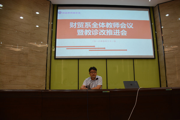 5月31日上午9:15,财贸系在名匠报告厅召开全体教师会议暨教诊改推进会。全系教师出席了会议,会议由财贸系主任王飞主持。