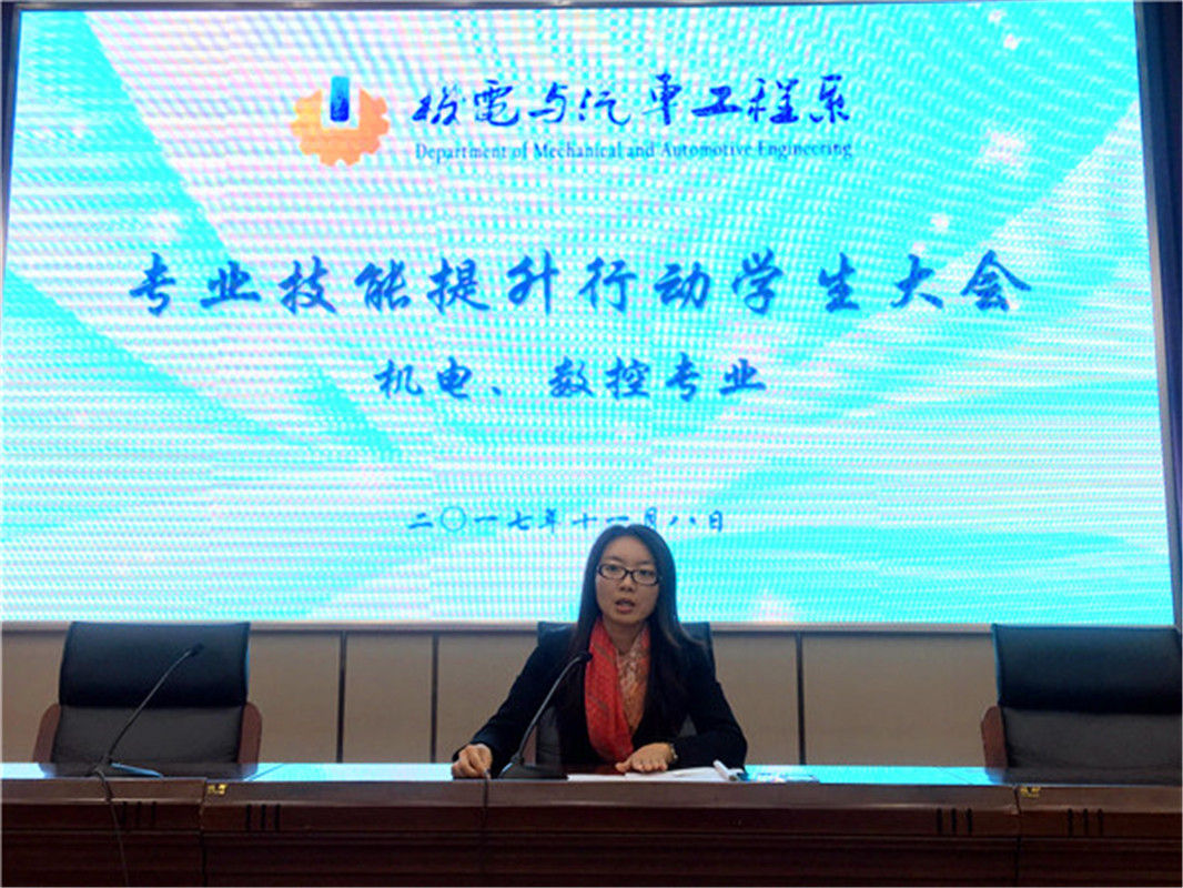 11月9日上午10:55分,机电系于文苑报告厅召开专业技能提升行动学生大会,机电与汽车工程系主任吴樱樱主讲,数控、机电专业学生出席会议。 本次会议紧扣“工匠精神”四个大字,要做工匠,必须要有“精气神”和“严谨的思维,踏实的行动”,吴樱樱主任对数控、机电专业学生的性格、行为、思维方式等进行了实例分析,对行业前沿技术和专业前景进行了剖析,对本学期来与会专业学生的课堂、实训、技能阶段性表现给予了肯定,她寄语学生一是要努力学习,积极提高职业素养,提升专业技能;二是要心怀理想,让目标成为奋进的动力;三是要养成习惯,让优秀成为人生的方向;四要练就本领,让技能成为青春行走的能量;五要锤炼品格,让素养成为竞争的砝码。吴主任表示,系部也会积极搭建阶段性实训、实训周、技能拉练、专项培训等方式,利用校内外实训基地、校企合作单位为同学们提供学习、历练的技能提升平台。 通过本次会议,全体与会同学受到了激励和启发,树立了技能学习的目标和信心,促使他们努力提高职业素养,提升专业技能,成为技能过硬的高素质人才。(蔡文宇)