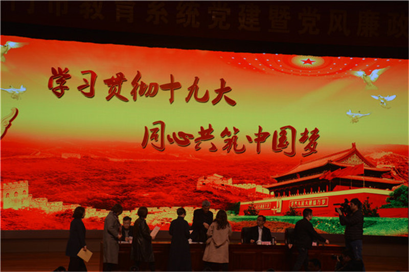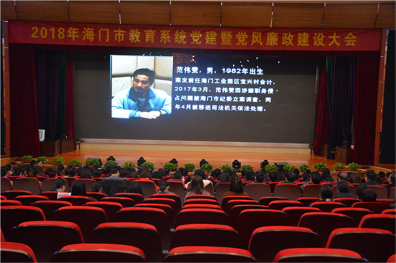 3月15日下午, 2018年全市教育系统党建暨党风廉政建设会议在我校举行,海门市教育局机关领导、直属单位全体成员,各中小学校长、党组织正副书记、纪检委员,乡镇幼儿园正副园长,各社区教育中心校长,以及2018年校安工程项目建设学校的分管教学校长(园长)一起参加了本次会议。 会议由海门市人民政府教育督导室主任、教育局党组副书记俞兆新主持,共分三个议程。 第一个议程:观看党建工作和党风廉政建设专题片。两段视频分别回顾了2018年海门党建和党风廉政建设工作的开展情况,全面梳理了工作成绩,也明确指出了存在问题。尤其是党风廉政建设专题片,列举了慵懒散慢拖等种种典型事例,让与会同志再一次感受到党纪的严肃性和党风廉政建设的强大威慑力。 第二个议程:各党组织负责人向海门市委教育工委书记、教育局党组书记、局长许新海局上交2018党建和党风廉政建设责任状。 第三个议程:许新海局长作2018年教育系统党建和党风廉政建设报告。指出,2018年全市教育系统将以认真贯彻十九大精神为引领,全面落实海门市委各项工作要求,认真完成各项党建任务,切实强化党风廉政建设,努力开创新时代海门教育发展新局面。 据悉,为提高开会效率,党建暨党风廉政建设会议之后,教育局接连安排了开学工作调研通报会和重点工程建设推进会议,以及分学段举行的开学工作调研通报会。总计8个会议放在一个下午召开,给我校的后勤保障服务提出了更高要求。我校高度重视,周密准备,科教大会堂等五个会议场所均安排专人负责到位,参会同志的用车都得到有序、妥善安排,各项会议保障任务再交一份满意答卷。(黄伟海)