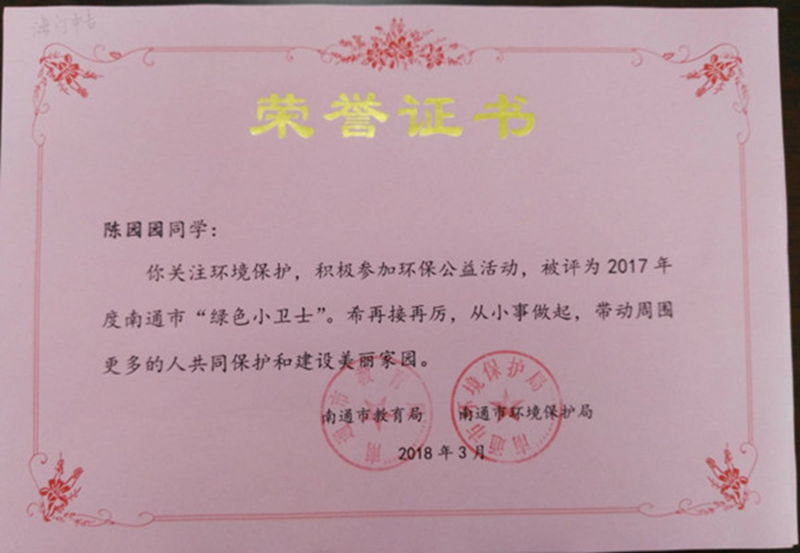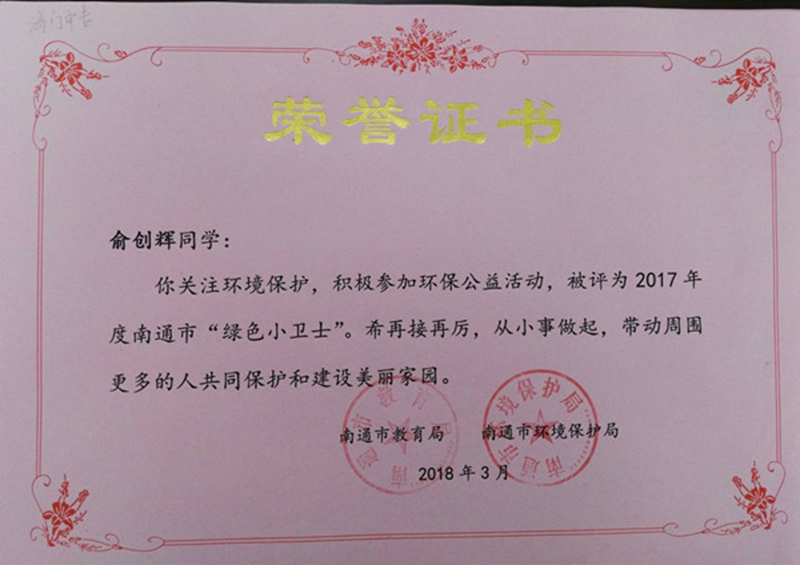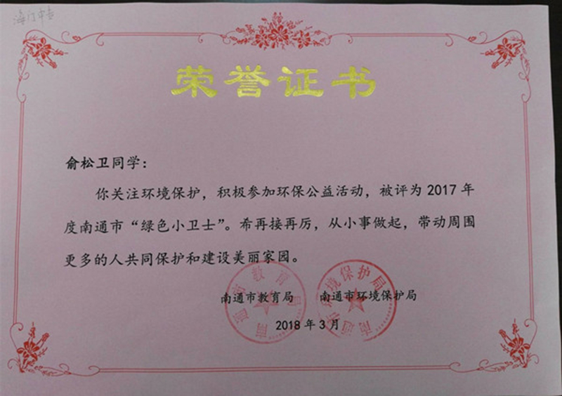 我校陈园园同学、俞创辉同学、俞松卫同学被南通市教育局、南通市环境保护局评为2017年度南通市“绿色小卫士”。表彰他们关注环境保护,积极参加环保公益活动。(黄彩萍)