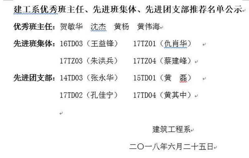 建工系优秀班主任、先进班集体、先进团支部推荐名单公示