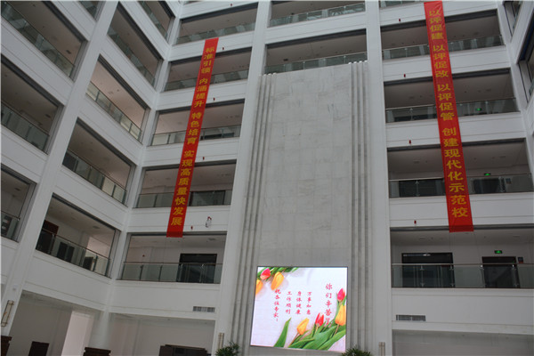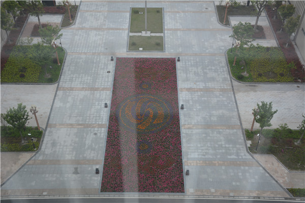 学校为本次现场考察营造了良好的工作氛围。图文信息大楼前摆出了含有学校校标的献花图案。大楼内天井北侧,悬挂了创建工作的宣传标语。校园里绿树葱郁、彩旗招转,到出呈现一派生机勃勃的喜人景象。