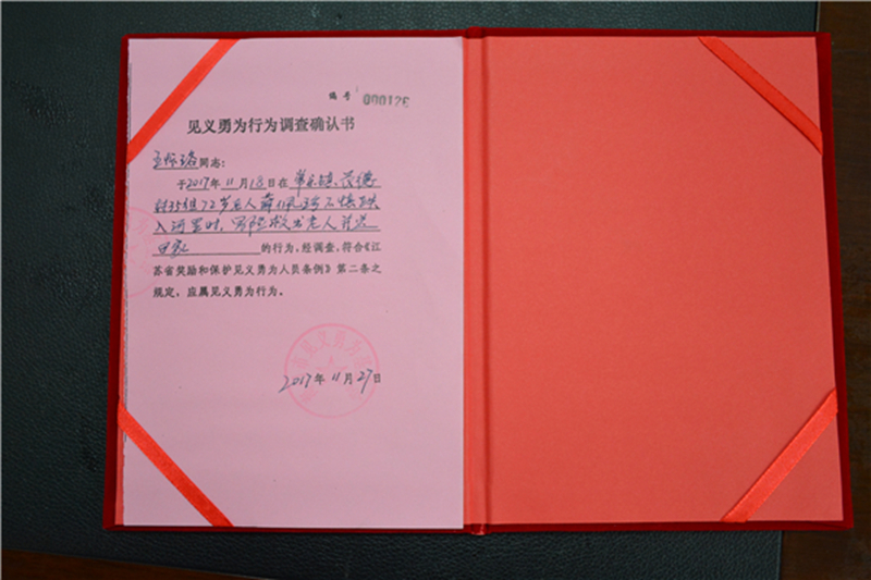 江苏省海门中等专业学校建筑工程系学生王忻珞同学于2017年11月18日勇救常乐镇长德村35组72岁薛佩珍老人的事迹在社会上引起了很大的反响,近日王忻珞同学被海门市社会管理综合治理委员会办公室和海门市见义勇为基金会授予“见义勇为”荣誉称号,并获得了由海门市见义勇为基金会颁发的奖金和奖品。