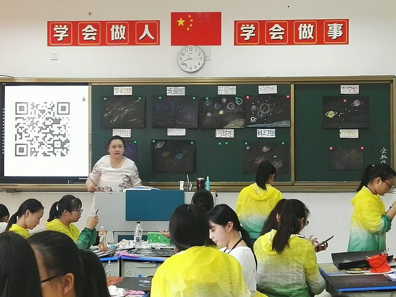 二维码课堂是本堂课的主题,通过二维码的解码,让学生温故知新,课上充分运用信息化手段引导让学生感受肌理艺术的美,进而引出本节课主题《喷绘法》。什么是喷绘法?星空又与喷绘法有什么关联?顾老师首先引用郭沫若的诗《天上的街市》让学生通过诗歌感受星空的美丽意境,随后通过《追逐星空》这一短视频,学生直观感受到星空的魅力,引发学生的创作欲望,接下来借助易企秀帮助学生直观学习喷绘法的肌理制作方法,最终运用喷绘法帮助学生完成《星空》主题的装饰画。顾晶澄老师在对“喷绘法”这一肌理制作讲解过程中,采用信息化和实际展示等手段,不仅让学生深刻掌握喷绘法这一肌理制作的概念,而且对其他肌理制作的过程产生了浓厚的兴趣。在实施操作中,顾老师亲身示范,展示作品,学生分小组进行创作,遇到问题先进行小组讨论,教师后逐组辅导,形成积极合作的学习气氛。