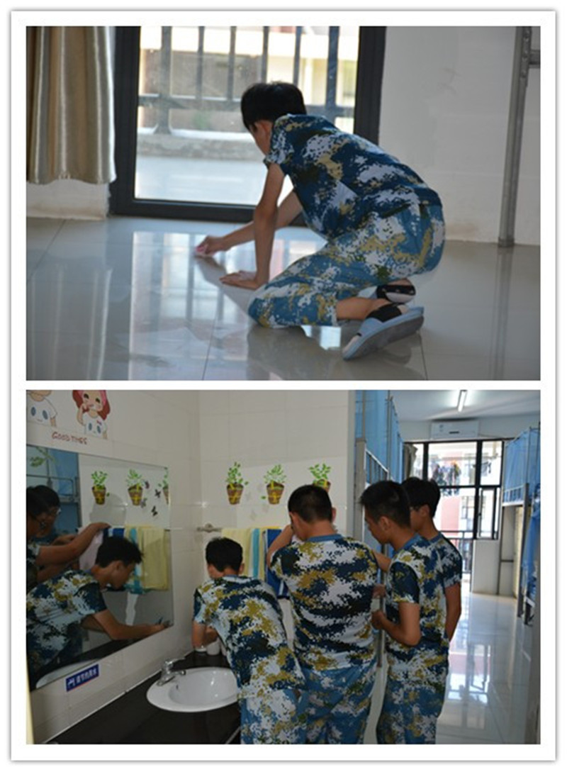 首先各班班主任从床被叠放到牙膏牙刷的45度角摆放、毛巾的折挂、内务评比标准等全方位详细解读,强调了内务整理的重要性。接着教官为同学们示范军被叠放步骤,在经过虚部掏平、压平、两次对折等步骤后,“豆腐块”的大体形状便出现了,再经过“三分叠七分修”的工作之后,标准的军被便呈现在大家眼前。顾辉主任也亲自上阵,给同学们示范毛巾三折叠法及摆放要领,班主任们更是手把手地对各宿舍进行逐一指导。经过短暂的培训,我们的同学开始动起手来,拖地、刷马桶、叠被子、叠毛巾……经过大家的辛勤劳动,学生宿舍焕然一新。
