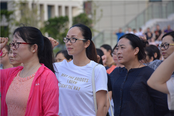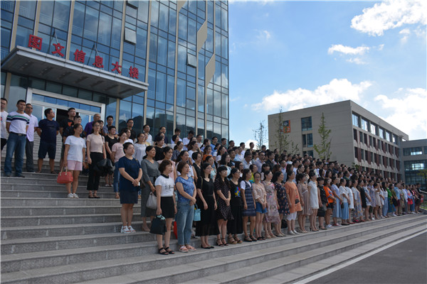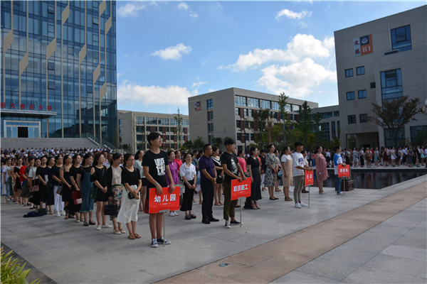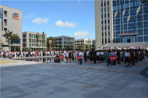 上午8:30,海门中专图文信息大楼南广场,五星红旗在雄壮的国歌声中冉冉升起,全体教职员工整齐站队,一起迎接新学期的正式开始。
