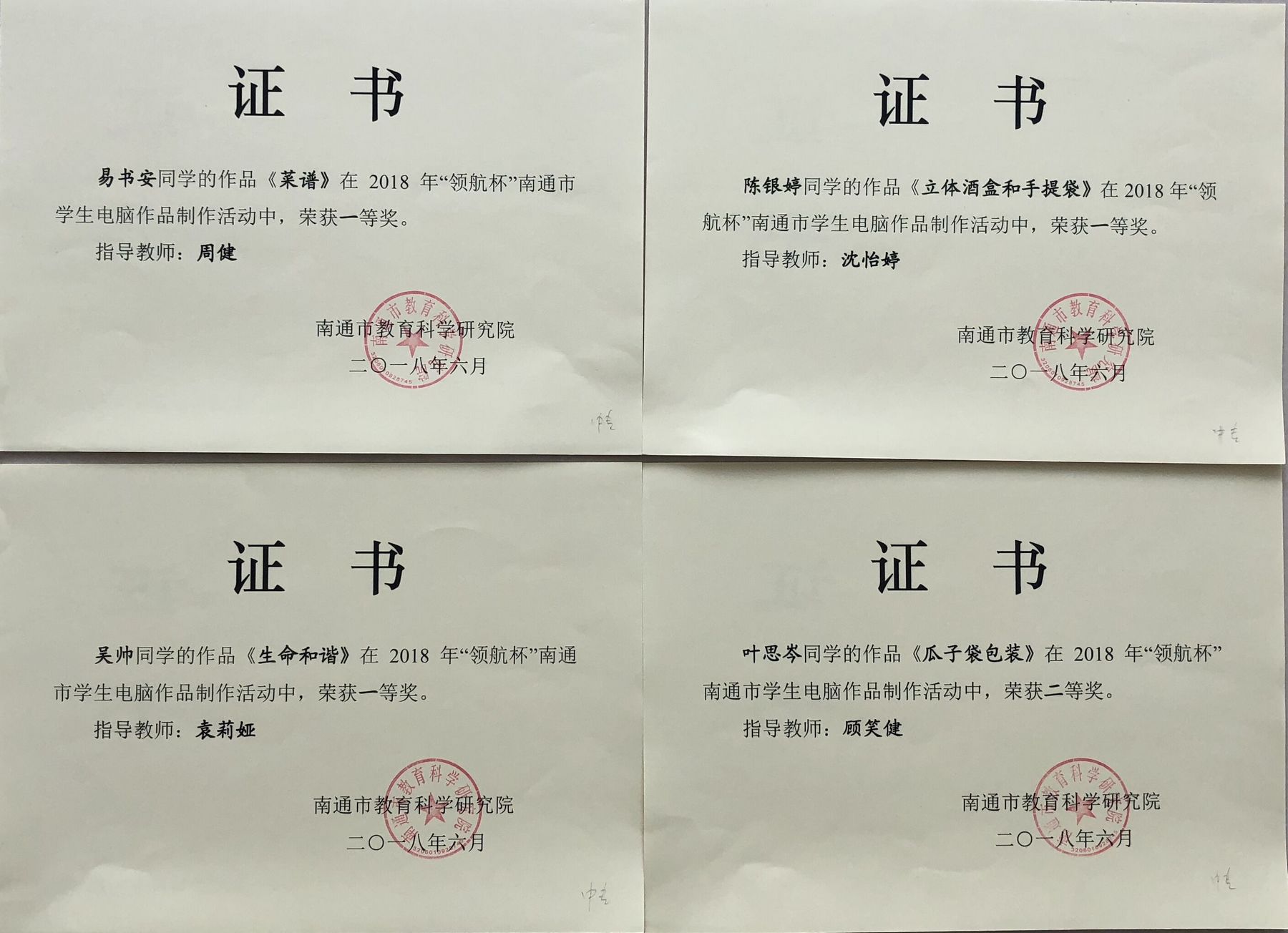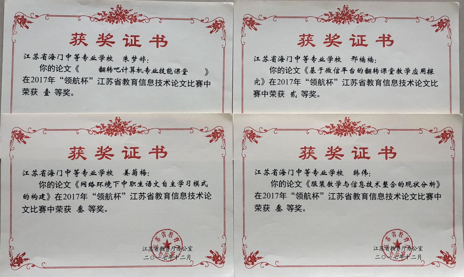 在2017年“领航杯”教育信息技术论文比赛和学生电脑作品制作比赛活动中,我校取得优异成绩。其中朱梦婷老师获论文比赛省一等奖,邢楠楠老师获省二等奖,韩伟、姜菊梅老师获省三等奖;王若菲老师获南通市三等奖;周健、沈怡婷、袁莉娅老师指导的学生电脑作品获南通市一等奖,顾笑健、顾炜老师指导的作品获市二等奖,戴晓玉老师指导的作品获市三等奖。