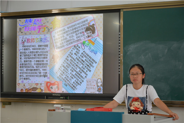 全校的红歌唱响完毕,主题班会准时开始。同学们群策群力,为表达对老师的敬意,精心排练,认真组织,用歌声、诗歌朗诵等形式,为老师送上了自己的祝福。独特的创意,丰富的想象,绚丽的色彩,生动的内容,渲染着节日的气氛,也感动着每一位老师。在班会进行中,班主任老师们也通过一段段生动的故事,为同学们上了一节尊师重教的中国传统文化课。通过程门立雪、马门立雨的典故,以及毛泽东、居里夫人感念师恩的小故事来教育学生如何尊师重教,怎样做到尊敬老师。