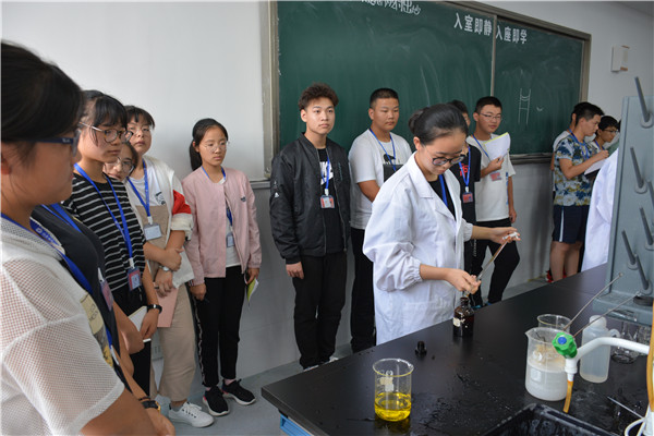 下午第七节课,18EZ08化工专业学生参观了化工实验室。同学们观看了学长学姐们有条不紊、认真严谨的实验操作,深受感染,纷纷表示要以学长学姐为榜样,把握现在,夯实基础,为三年后的高考铺好路。随后,正在实验室上课的谢建辉老师为新生讲解了化工实验的操作内容、步骤及注意点,大大激发了同学们的学习热情和兴趣。