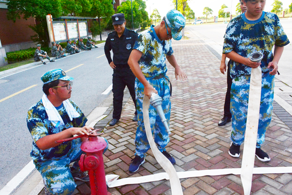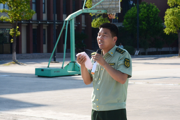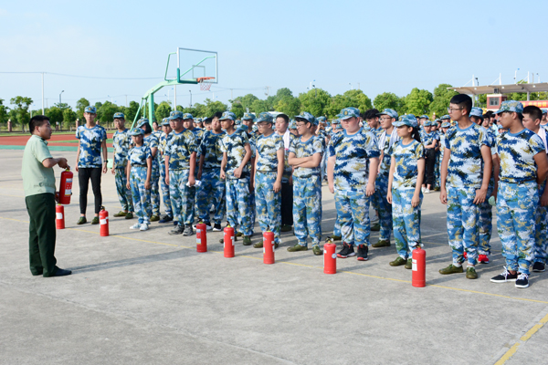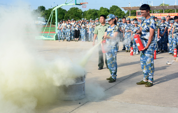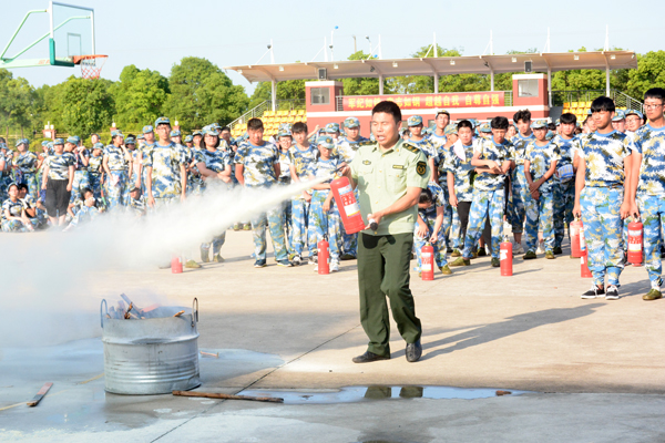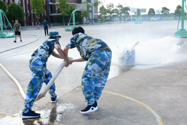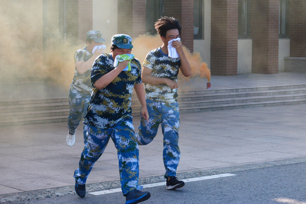 伴随着2018级新生消防逃生演练总指挥施锡斌一声清脆的哨音,只见三幢宿舍楼内瞬间烟雾弥漫,紧急“火”警呈现,警报声响起,同学们猫着腰,用湿毛巾捂住口鼻,有序“逃”生……3分钟后,宿舍楼内,空无一人,全部撤离到安全地带――篮球场。按演练方案,各连长迅速清点人数,向营指导员汇报人数,营指导员汇报给总指挥。最后,施锡斌主任和海门市消防支队宣传科的孙以军科长分别进行了总结点评。孙以军科长从发生在上海商学院和海门三星叠石桥的真实火灾入手,向同学们讲述了校园安全和宿舍安全的重要性,重点指出了在人员较多的宿舍中如何树立消防意识、如何预防火灾、火灾现场如何逃生等,要求同学们树立高度的安全意识,珍爱生命,远离危险。 第二项为室外灭火演练。