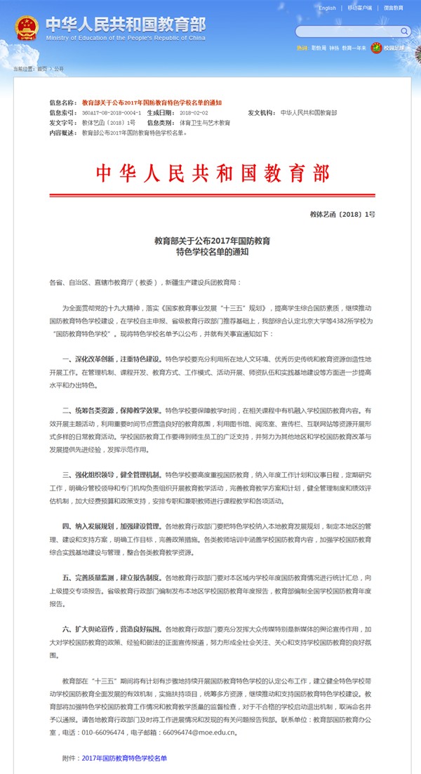 近日,教育部发文(教体艺函〔2018〕1号)公布了2017年“全国国防教育特色学校”评比结果,我校荣膺“全国国防教育特色学校”荣誉称号。此次教育部评选的国防教育特色学校,是由学校自主申报,省专家组实地考察、教育行政部门审核、推荐,最终由教育部进行综合认定。 近年来,我校高度重视国防教育工作,始终将国防教育作为立德树人的重要载体和有效抓手,把国防教育融入到我校学生思想政治教育体系,纳入学校人才培养全过程,建立了一套“重点明确,层次丰富,全面覆盖”的国防教育体系,探索出一条以爱国主义教育为核心,全面提升学生军政训练及国防教育质量的有效路径;学校每年将新生军训作为必修课纳入正常教学计划,同时通过一系列国防教育活动的开展,有效增强了学生的组织纪律性和国防观念,培养了学生的爱国主义精神、集体主义精神和吃苦耐劳精神,大力提升了学生的综合素质,此次荣誉的获得,是对我校国防教育工作的充分肯定。 今后学生工作部将以本次获评“国防教育特色学校”为契机,进一步创新国防教育各项工作,发挥国防教育的引领示范作用;进一步深化理论研究,优化服务管理,不断探索国防教育新模式、新方法,谱写我校国防教育工作新篇章。(陆锦俊)