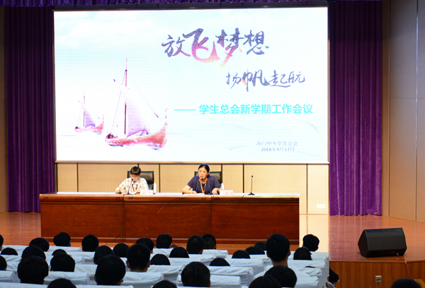 为了进一步加强学生干部的工作责任感,充分发挥学生总会在学生管理中的作用,提高学生干部的工作能力和工作水平,9月17日中午12:15海门中专新学期第一次学生总会工作会议在文苑楼报告厅隆重举行。学工部李建英主任,学生总会主席陈倩雯及180余名学生总会成员参加了大会。 新学期、新目标、新气象,学生会主席陈倩雯提出在新学期要进一步加强学生会成员的纪律观念,强化时间观念、创新意识和服务师生的理念,深入扎实推进学生总会个各项工作。随后又具体安排部署本学期学生总会各部门的工作任务。