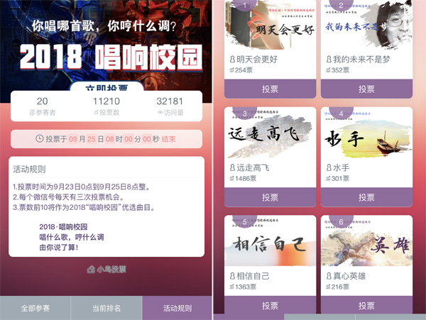 “唱响校园”是新学期学校开展的一项特色活动,每天上午大课间,学生在教室内全体起立,在广播音乐的统一伴奏下,在教室内视频的同步播放下,校园内会同步响起学生齐唱的歌声,励志曲目、经典红歌,给美丽的校园再添生机和活力。 为进一步激发学生参与活动的积极性和主动性,使传唱歌曲更加迎合学生喜好,更富有时代精神,9月中旬,学校面向全体师生征集本学期“十佳传唱歌曲”,推荐曲目要求具有丰富的思想内涵,内容励志向上,能体现时代精神,增强学生爱国、爱校、爱家情怀,同时适合集体大声传唱。全校师生积极参与,各系部在认真组织和把关的基础上分别推荐5首曲目参加校级选拔,学工部对推荐曲目进行了审核,并择优选取了20首歌曲。 中秋假日,学生工作部与行政工作部联合,利用网络投票的方式组织师生投票,全校师生积极关注并参与投票活动,为心仪的三首歌曲投上一票。截至9月25日上午8点,《仰望星空》名列榜首,《明日歌》、《远走高飞》、《相信自己》、《大梦想家》等歌曲遥遥领先,上榜的前十首歌曲将作为本学期学校“唱响校园”活动优选传唱曲目。 你唱哪首歌,你哼什么调?2018,让我们一起唱响校园,一起拥抱美好的每一天!(黄 娟)