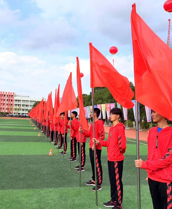 彩旗队肩负着运动会开幕活动的重要责任,代表着海门中专的形象与气质。时间紧迫,任务重大,彩旗队员每天下午,在邹熊冰副主任的组织下,在黄忠贤、孔佳宁老师的指导下,在校大操场进行训练。训练过程中,队员们举旗、摆阵、跑动,不停变换着阵势,彩旗队员们听从指挥、认真排练,不辞辛苦地在场上一遍遍地走好方队。他们以热情与自信一展建工系的风采,以他们的认真与刻苦为全运会开幕式的圆满举行贡献自己的一份力量。