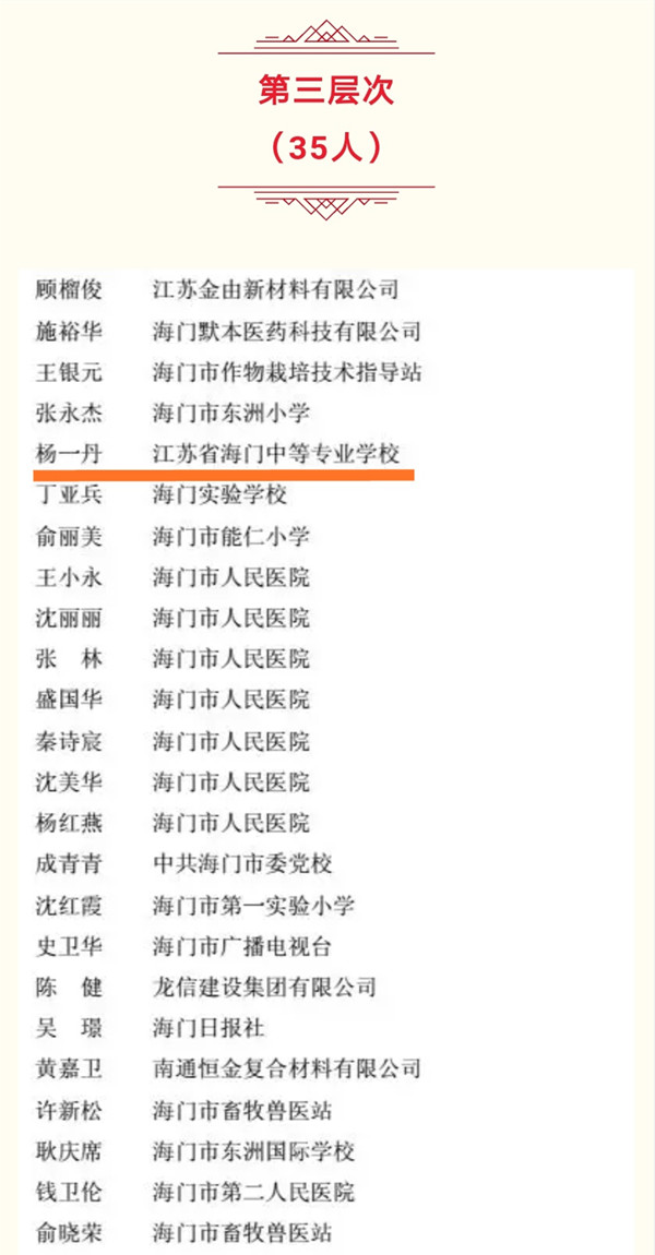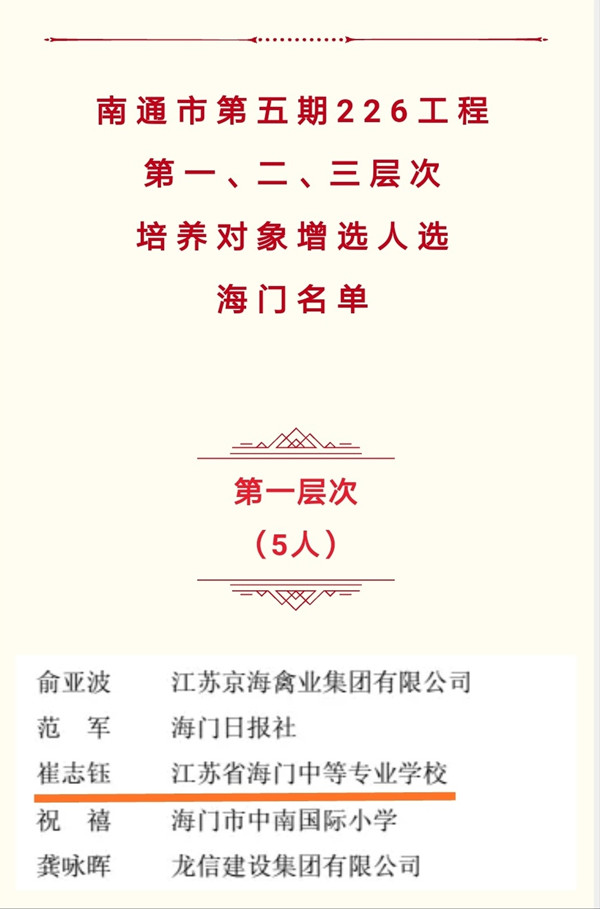 在昨日公布的第五期南通市“226高层次人才工程”培养对象名单中,我校崔志钰被确定为南通市“226工程”第一层次中青年首席专家,杨一丹被确定为第三层次中青年科学技术带头人,实现了我校人才培养的新突破。 南通市“226高层次人才培养工程”旨在选拔一批政治素质好、业务水平高、创新创业能力强的中青年优秀人才,为实现南通“十三五”经济社会发展战略目标提供坚强的人才保证。这是南通市为加强高层次专业技术人才和高技能人才队伍建设而开展的一项重要工程,也是我校高层次人才培养的一个重要平台,对于入选者会给予组织培训、项目资助、发放补贴、配套奖励等综合培养激励措施。各层次培养对象每年将获得3至20万元科研项目资助。 崔志钰、杨一丹作为海门中专的代表,入选“226高层次人才培养工程”,这既是对教师个人成绩的肯定,更是对学校师资队伍建设成果的肯定。我校将进一步激发优秀教师专业发展的动能,促成师资“软件”的优化升级,培养出一大批推动学校可持续发展的中坚力量。(徐杨帆)