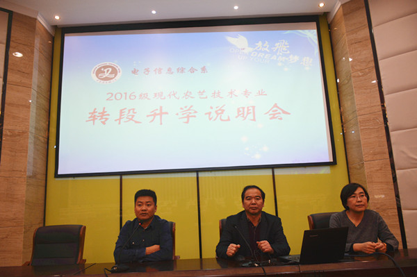 10月25日下午,南通科技职业学院园艺与景观工程学院院长孙正国、党总书记顾绘等人来我校开展现代农艺技术“3+3”中高职衔接工作,电信系在大师报告厅举行了2016级现代农艺技术专业转段升学说明会。会议由江勇主任主持召开,2016级现代农艺技术专业的全体学生和部分家长参加了此次会议。