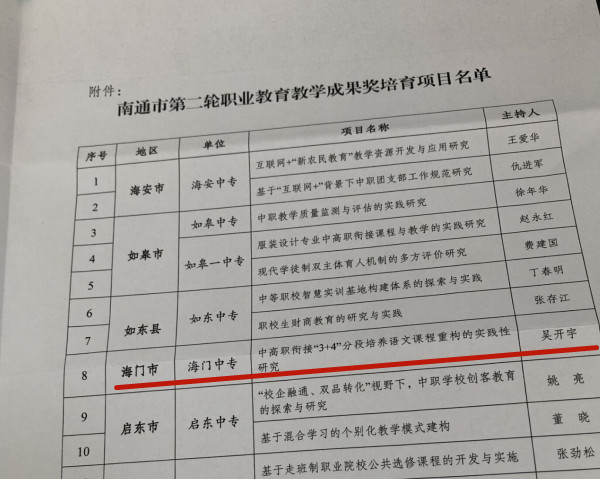 我校吴开宇老师的培育项目《中高职衔接“3+4”分段培养语文课程统整的实践性研究》顺利通过市教育局组织的省市级专家开展的材料初评和答辩复审,成为全市第二批职业教育教学成果项目。 国家级、省级、市级教学成果奖,是衡量我校职业教育发展水平的重要标志之一。“中高职衔接“3+4”分段培养语文课程统整的实践性研究”这一项目,在吴开宇老师的主持研究下,认真制定了创建工作方案,结合学校实际,对项目的推进采取了有力措施,通过创新和探索深化教科研工作。 下一阶段,项目组将依据教育局关于教学成果奖项目培育管理的相关工作要求,切实做好后期的培育工作,为省级、国家级教学成果奖的申报奠定扎实基础。(徐杨帆)