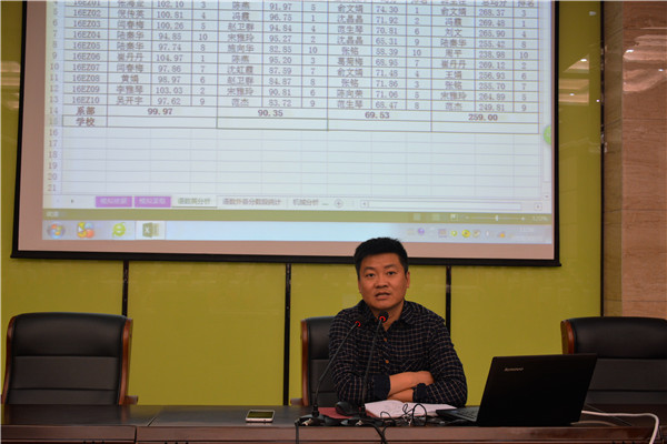 首先,江主任通报分析了本次联考成绩,从系部范围、四校范围两个角度,就班级语数外均分、各专业文化课均分、专业理论均分、各专业优生段分布人数进行了细致的横向和纵向比较,并作出了针对性点评。一组组详细的数据分析使与会师生对本次考试有了更全面的了解,既认识了自身优势又看到了存在的问题,感受到了差距和压力。
