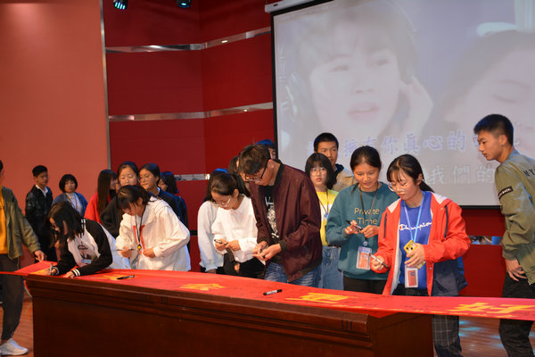 活动临近结束,进入许愿环节,主持人抽取了五位同学的心愿,他们的心愿都很美好,有的希望自己能在学生会越做越好,有的希望自己明天会更好。最后,沈豪杰主任对本次活动的最佳玩家以及最佳团队进行颁奖,全体学生会成员合唱《明天会更好》,18级新成员上台在横幅上签上自己的名字,以示自己的决心。