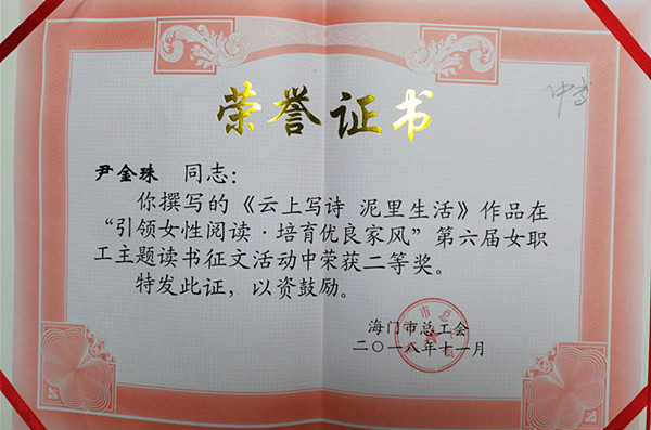 经贸系尹金珠老师在海门市总工会组织的“引领女性阅读·培育优良家风”第六届女职工主题读书征文活动中获二等奖。参加这次活动的作品共有184篇,经评委会评审,评出特等奖1篇,一等奖2篇,二等奖6篇,三等奖10篇,优秀奖20篇。
