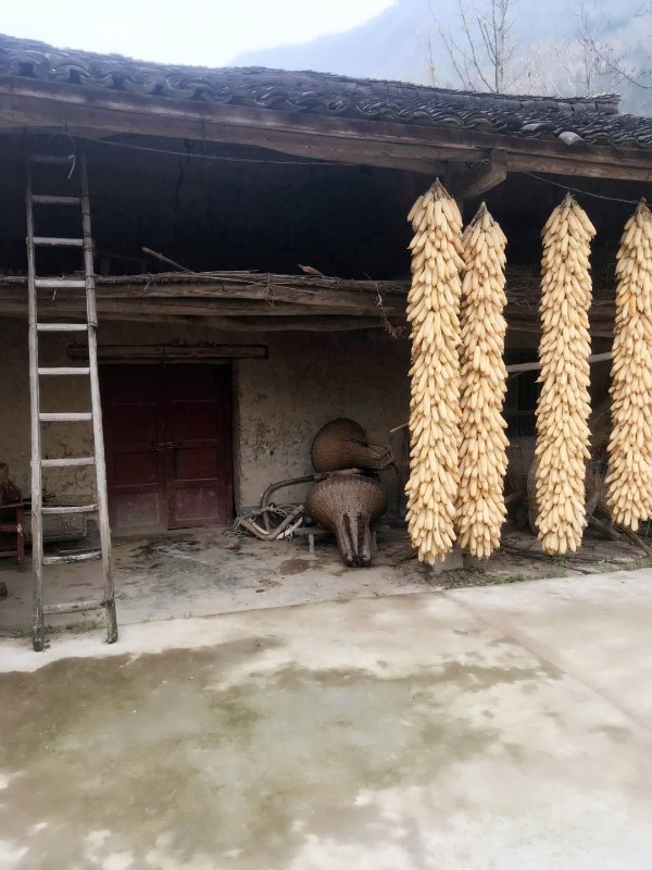 上午10点35分,我们来到了铁锁关村小于同学家,小于的父亲出来热情迎接。小山村非常安静,可听到山林中婉转的鸟鸣声。村中多为老人和儿童,成人一般外出打工了。小于的父亲在铁矿上工作时受了伤,所以在家干一些轻微的农活,母亲在山东打工。小于的哥哥是勉县职教中心汽修班的毕业生,现在在昆山汽车4S店工作,月收入6千多元。小于家可以说已经基本脱贫,这可以从他们家新旧房子的鲜明对比中可以看出来。老屋前挂了以前在图片上看到过的玉米棒子串,我在旁边合了影。