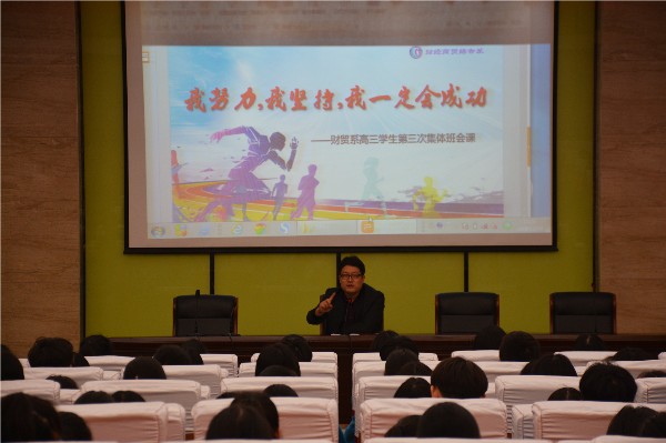 11月19日下午1:20,财贸系在謇翁楼精匠报告厅召开主题为“我努力,我坚持,我一定会成功”的16级高三集体班会课,会议由王飞主任主持主讲。
