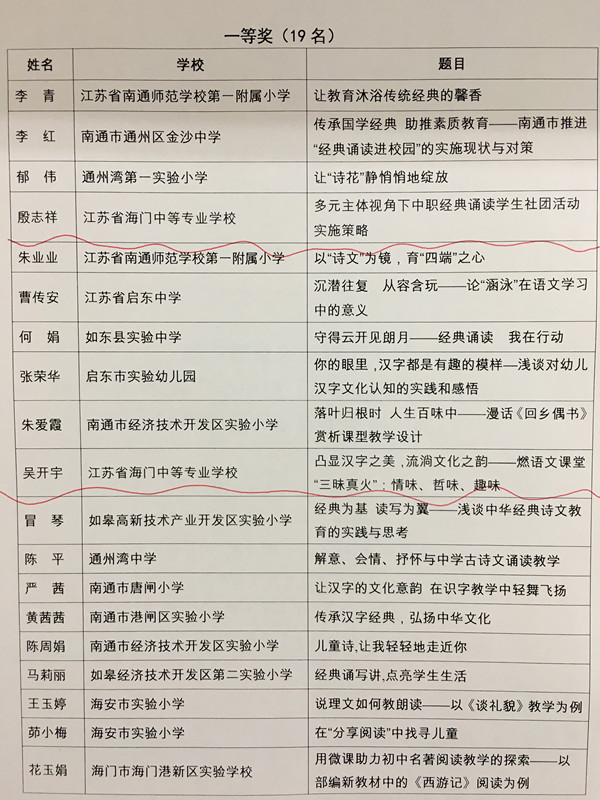 为了深入学习贯彻党的十九大精神,认真落实中办、国办《印发<关于实施中华优秀传统文化传承发展工程的意见>的通知》,不断提高中小学教师开展中华传统文化教育的能力,南通市语言文字委员会、南通市教育局联合举办南通市第二届中小学教师中华经典诵讲写能力论文评比活动。 原味语文工作室自成立以来,坚持以“原味课堂”与“学生社团”作为课堂内外的两大辐射源,致力于学生人文素养与职业素养的提升,一路耕耘一路收获。 本次活动,工作室仔细研读文件,领会精神,结合自身发展以及工作室的主要研究方向,选派了2位成员参加比赛。成绩揭晓,殷志祥的《多元主体视角下中职经典诵读学生社团活动实施策略》,吴开宇的《凸显汉字之美,流淌文化之韵——燃语文课堂“三昧真火”:情味、哲味、趣味》均获一等奖。