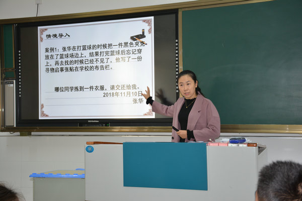 11月20日上午第二节,信息系黄锦红老师在18CD01班开设了一堂题为《应用文写作——启事》的海门市公开课,教学工作部主任施晓东、信息系副主任陈建华、机电系副主任叶海伟、财贸系副主任施向华、语文教研组杨菊、陈慧、刘虹、王海燕、姜菊梅等二十多位老师参与了听课评课活动。