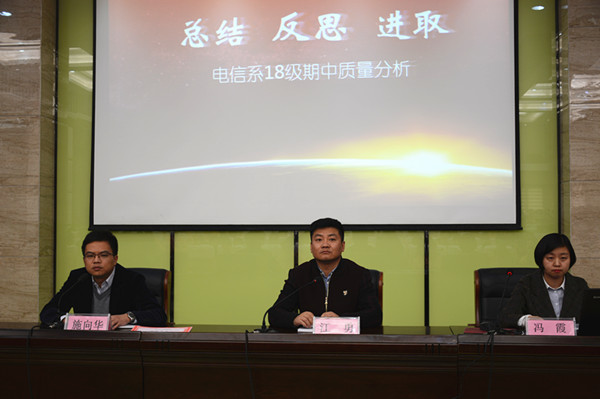 11月22日下午15:10电信系在精匠报告厅召开18级期中质量分析会议,会议由18级蹲点主任施向华主持,系主任江勇及年级组长冯霞老师参加。