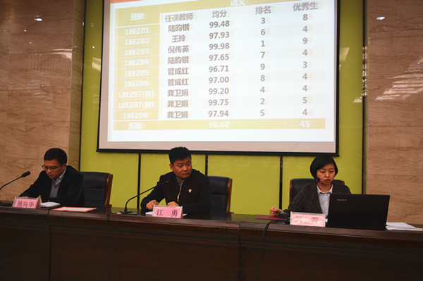 冯老师首先从系部及各班语数外均分、优生数分析各班的情况。指出语数英中数学学科班级及个体差异较大,并表扬了各科的榜样学生。其次冯老师从专业理论分专业类比分析,指出同轨专业班级间的差异以及问题科目,并针对性地就六大专业学生个体情况提出要缩小弱科两极分化现状。
