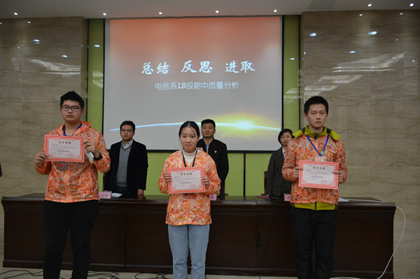 随后江主任、施主任及冯老师共同给各科各专业考试成绩优异学生冯力凡等共十人颁发了“电信系优秀学生”称号,号召大家以这些同学为榜样。