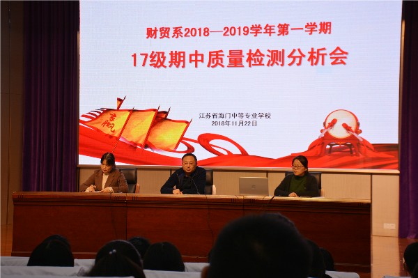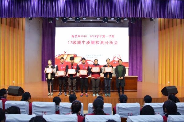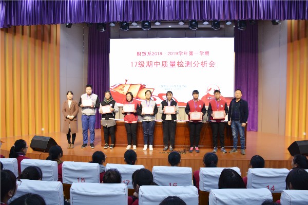 11月22日下午3:20,财贸系17级全体学生集聚文苑报告厅,参加期中检测质量分析大会,本次会议由朱娟副主任主持。