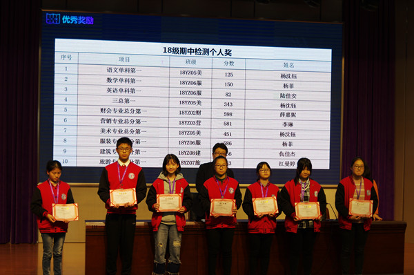 会议第二个议程是王飞主任宣布表彰决定并给优秀学生颁奖。表彰对象包括语数外单科第一名及三门总分第一名,还包括各专业总分第一名。