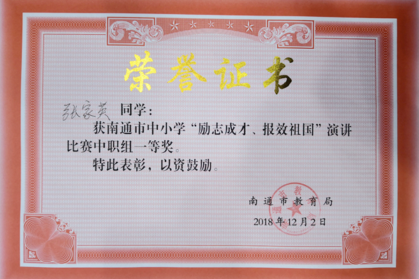 12月2日,南通市中小学生“励志成才,报效祖国”演讲比赛在南通西藏民族中学举行。我校财贸系18YZ03张家英同学代表海门市参赛,夺得中职组一等奖的好成绩。