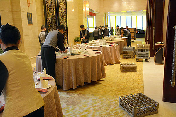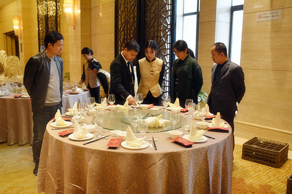 宴会摆台以中餐宴会十人台摆台为考核内容,对学生铺台布、摆椅子、摆放餐碟碗筷、餐巾折花等环节逐一进行打分,从仪容仪表、行动举止、操作技巧、餐具定位等多个方面对学生进行评定。