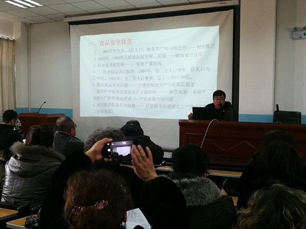 讲座期间,肖老师作为农业方面的专家,首先生动的讲述了建国初期国家粮食匮乏问题,由远及近的提出了目前中国所遭遇的挑战引出了食品安全问题,吸引了大家的兴趣,对于食品质量、食品安全、食品卫生等教师比较关注问题进行了详细的讲解,同时结合实际状况,向在场教师展示了一些关于我们身边存在的食品方面的应用案例,并且对我国面临的食品安全形势及未来发展方向作了详细的分析。另外,针对当前食品安全问题,肖老师谈到了许多国家的政策与措施,使与会教师对食品安全问题有了深刻的认识。