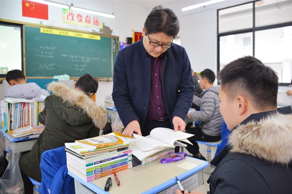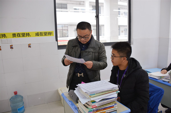 第二个阶段是主任室成员深入教室抽查学生学习资料。5日下午大课间,王飞主任带领殷志祥、朱娟两位副主任深入16级高三教室,对部分学生学习资料进行现场抽查,不但查看了任课老师平时批改学生作业情况,还检视了学生课堂笔记和错题集,并对部分学生学习习惯的改进给予指点。