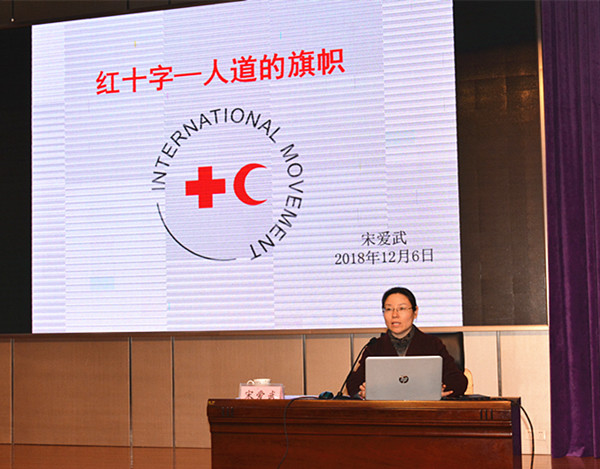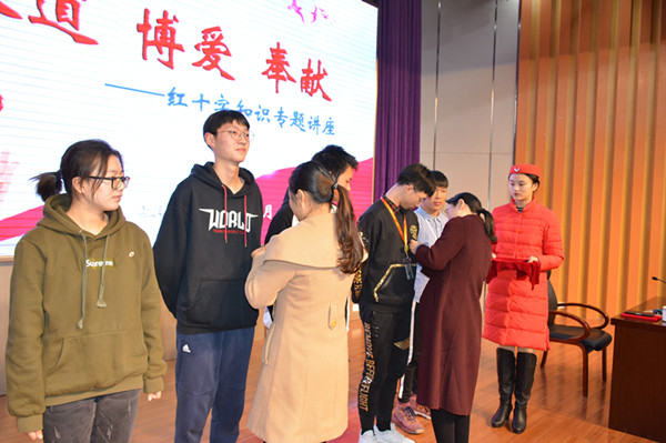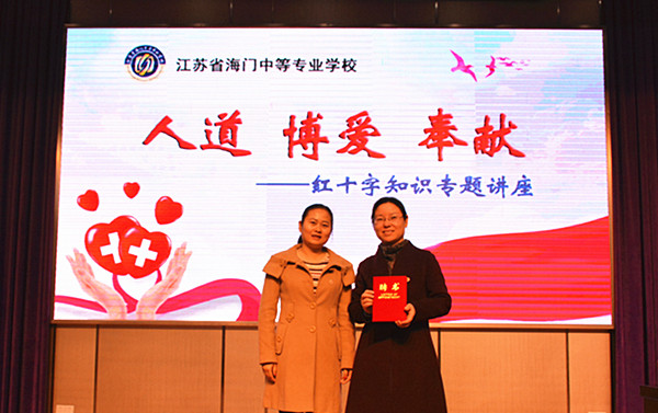 为推进学校红十字会工作,在学生中传播和弘扬“人道、博爱、奉献”的红十字精神,12月6日下午,市红十字会党委书记、常务副会长宋爱武应邀为我校近400名学生做专题知识讲座。讲座在B1楼文苑报告厅举行,参加活动的有学工部副主任周健、系部德育主任、班主任以及各系学生代表。 学工部副主任周健主持活动。周主任为大家介绍了我国在做好红十字青少年工作方面的成绩,并结合我校红十字教育具体活动对创建南通市红十字示范学校、在校内外建立红十字志愿者活动基地进行了简单的说明。 宋爱武会长为我们学生做了以“红十字——人道的旗帜”为主题的精彩讲座。宋会长结合生动的历史故事为我们介绍了世界红十字会发展的历史和国际地位。围绕“红十字会是什么?”“红十字会做什么?”以及“我们能为红十字会做什么?”三个问题展开。宋会长用大量的实践资料阐述了红十字会“保护、救助、预防”三大主要活动的内涵,用具体的活动图片为我们介绍了“秉承红十字精神”“学习红十字知识”“投身红十字活动”“传播红十字理念”这四个青年学生红十字活动项目。宋会长始终将“人道、博爱、奉献”的红十字精神贯穿其中,她希望我们同学能在红十字精神的感召下,用自己的学识积极实践,成为一个红十字精神的传播者和弘扬者。 讲座结束后,团务书记江金丹代表学校向宋爱武会长颁发聘书,正式聘请宋会长担任我校“红十字志愿者活动基地”的校外辅导员。江书记和宋会长一起亲手为学生代表佩戴了红十字徽章。 下周,我们学校将迎来“南通市红十字示范学校”现场评选,相信在宋会长的指导下,我们的学生一定能当好红十字知识宣传员,做好红十字精神的传播者,我校的红十字工作也一定会呈现出更加崭新的面貌。(黄 娟)