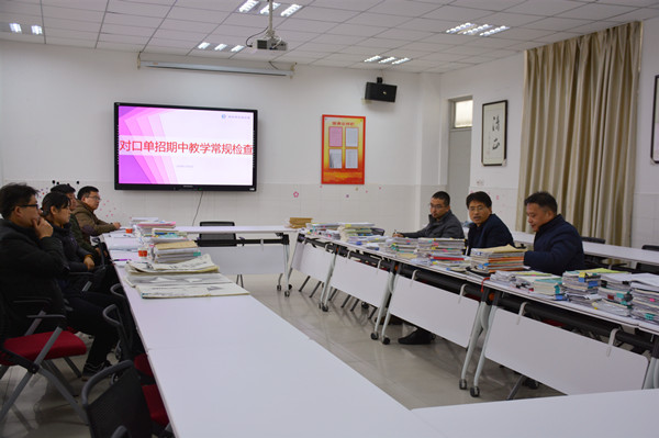 12月10日上午10:20,周桂岐副校长带领教学工作部施晓东主任及王茂副主任来到謇公楼226会议室,对单招两大系部进行期中教学常规检查,财贸系王飞主任、朱娟副主任热情接待,电信系江勇主任、施向华副主任参与了检查活动。