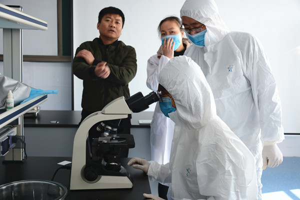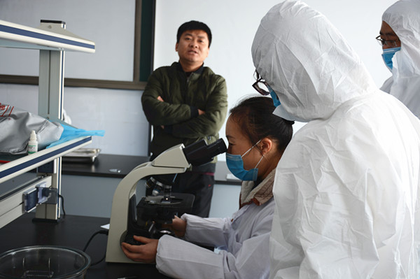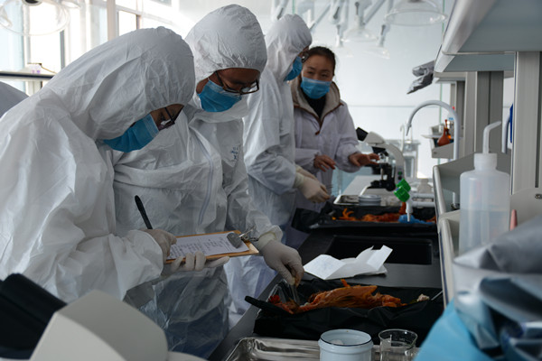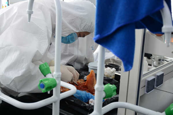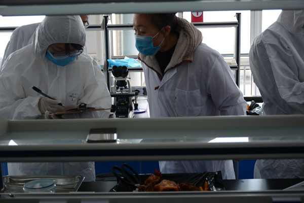 所有参赛队伍需在规定时间内按照要求完成解剖,完整地分离出鸡的呼吸系统、消化系统等各个器官,并能准确地描述其中病变的名称和程度等。他们于赛前穿好防护服,戴好口罩等防护设备,随着裁判一声令下,从计时秒表按下的那刻起,比赛选手首先迅速地戴上手套,掀开蓝色的手术单摆放器材。然后麻利地利用手术剪及镊子剖开鸡的腹腔及胸腔,分别取出心脏、肝脏、脾脏、肺脏、肾脏等组织。参赛选手们合理分工,1人操刀剖解,1 人观察显微镜、填写报告。两人团结协作,通力配合,操作流畅,技巧娴熟,比赛场面紧张有序、扣人心弦。最后评委根据每组选手的表现以及报告的书写进行严谨、认真地打分。在听完裁判当场的评价之后,选手们再次比对剖解的结果和报告,纷纷感叹收获良多!