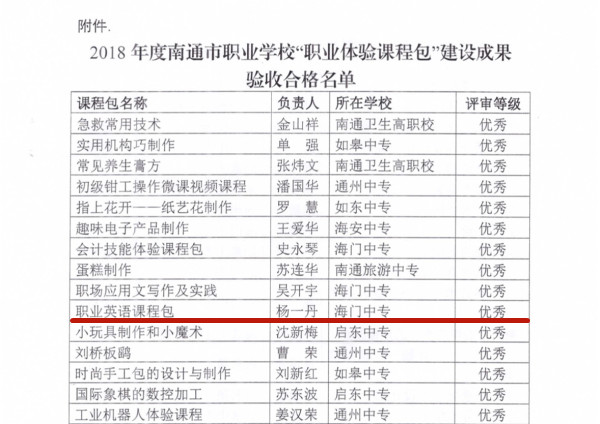 12月17日,根据《关于公布2018年度南通市职业学校“职业体验课程包”建设成果验收结果的通知》(通教科研〔2018〕406号),在对62个课程包项目进行验收评审后,认定15个课程包为优秀,“职业英语课程包”就是其中之一,验收结果为优秀。 成绩的取得离不开课程负责人的精心谋划、周密部署,和职味英语名师工作室成员们的凝心聚力、通力合作。根据《关于组织职业学校“职业体验课程包”建设成果验收的通知》(通教科研〔2018〕331号)的要求,2018年12月上旬南通市教育科学研究院将组织专家对首批立项的30个“职业体验课程包”重点建设项目和32个一般建设项目进行验收和评审。 接到通知后,职味英语名师工作室领衔人杨一丹立即召开验收工作推进会,传达了会议精神,解读了验收内容和验收要求,并对验收工作进行了细致地部署,明确工作任务,落实责任到人。 根据验收要求和评分标准,全体工作室成员认真梳理课程包前期建设中存在的不足,列出问题清单,统一模板,精心规划,关注细节,丰富资源,讲练结合,进一步完善课程包建设。 同时,在全校范围内进行职业英语课程包应用的推广。通过职业英语课程包的学习,学生的学习时空得到拓展,学习内容得到拓宽,学习方式得到改变,学习变成更立体,更深厚,更宽泛,更有趣,学习成果更丰富。课程包的建设、应用、推广成效显著。 职味英语名师工作室致力于在常规英语课堂的基础上,以“项目体验学习、提升实践能力”为指导思想,工作室将以此为契机,推出更多更好的课程资源,为学生的英语学习添加一抹浓郁的职味。(徐杨帆)
