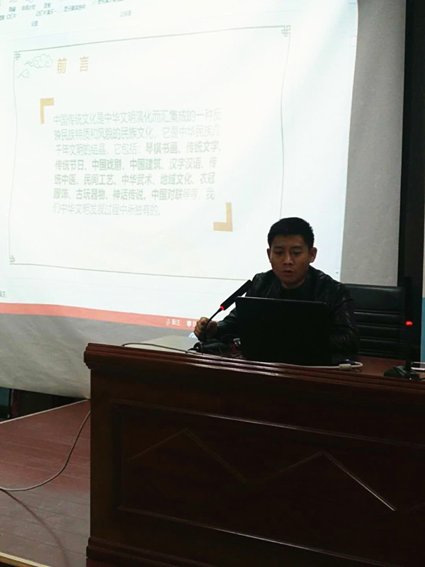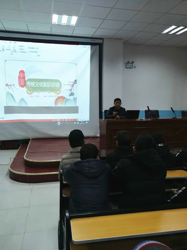 为了提高民族学生的国语能力及文化素养,在克州州党委及州教育局的高度重视下,本学期全系学生开设了中华传统文化走进校园的活动,2018年12月18日来自江苏海门的援疆教师、现担任工业工程系副主任的沈振海老师为全系师生带来了一场题为“让中华传统文化走近你身边”的讲座。