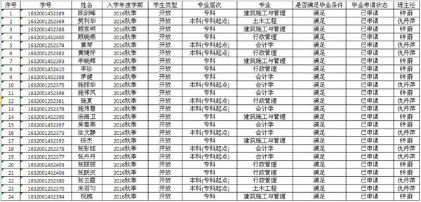 近日,国家开放大学江苏分部公布了2019春毕业生名单,我校24名开放教育学员修完全部课程,满足毕业条件,可以提前办理毕业证书。 此次提前毕业的24名学员均为2016年秋季入学的本(专)科学员,其中本科行政管理3人,会计学6人,土木工程2人;专科行政管理4人、会计学3人、建筑施工管理6人,分别由仇丹萍、钟蔚担任班主任。按照正常学制,本期学员的毕业时间为2019年7月份,而这24名学员比其他学员提前了半年拿到毕业证书。 近年来,继续教育部在做好招生工作的同时,加强班主任队伍和课程老师队伍建设,要求班主任抓住三个环节:缴费注册、课程报考和分数确认;课程老师搞好三个侧重:联系学员、课程导学和作业催缴。尽心尽责、多层面、多角度的做好服务保障工作,不断提高学员的毕业通过率。