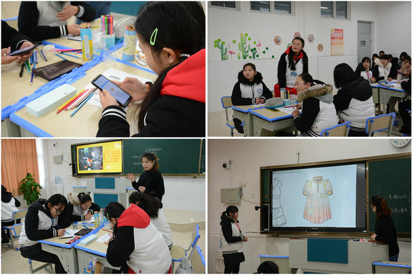 上午第二课,市教育局职社科科长朱士华,教务处主任施晓东,信息系主任徐亮、副主任陈建华、沈豪杰以及系部十多位老师听取了黄煜雯老师在18CZ05班的一堂题为《女童服装中的色彩设计》的专业课。