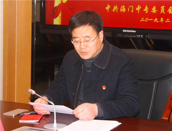 2月22日下午3:30,行政支部党员在A楼百度厅参加了2月份党员“统一活动日”活动。支部书记洪龚明主任主持本次活动。 首先,党委委员、副校长周卫星同志为大家作了题为《让担当任事的干部脱颖而出》专题党课。周校长指出,在我们的管理过程中,要重用干事创业的好干部,这也是推动我校改革攻坚克难、发展爬坡过坎的客观需要。如果“李云龙式”的干部能获得施展才华、建功立业的舞台,“有为有位”的鲜明导向势必能激励更多干部投身谋发展抓改革的最前沿。周校长的党课立意深远,为全体支部党员指明了方向,我们既要“敢为”,又要“善为”,为学校领航计划的实现贡献力量。 会议的第二项议程是由洪龚明主任组织支部党员进行冬训学习。洪主任与大家分享了陈勇书记在全市2019年作风建设暨“四大专项行动”动员会上的讲话内容。洪主任由讲话中提到的“如何实现高质量发展”引发大家思考,要想改革发展不掉队,首要的是干部思想和能力不掉队。我们必须要珍惜已有的来之不易的发展局面,不断与时俱进,全力以赴,敢担当敢作为,用我们的高能力描绘海门中专新蓝图。 会议的第三项议程是冬训学习交流心得。支部党员代表黄蓉蓉、钱玉强和周健同志与大家分享了学习心得。三位同志来自于不同的岗位,从不同侧重为学校发展做出贡献,大家发言以点带面、深入浅出,共同表示要通过部门工作为学校发展锦上添花。 最后,全体支部党员在支部书记洪龚明书记的组织下一起重温入党誓词。大家紧握右拳,庄严宣誓。誓言既是一份初心,也是一份决心。重温入党誓词,也是重温当年的决心和信念。重温的意义在于与时俱进,在于恪守承诺。我们都应该适时回头看看自己来时的路,向更优秀的自己进发! 本次会议是新学期行政支部召开的第一次支部会议。新年有新气象,支部党员必将上下一心、齐心协力,以新面貌投入新征程。新年有新进步,我们必将不断汲取新知识、提升能力素质。新的一年,让我们再创佳绩,共立新功!(姜彦辰)